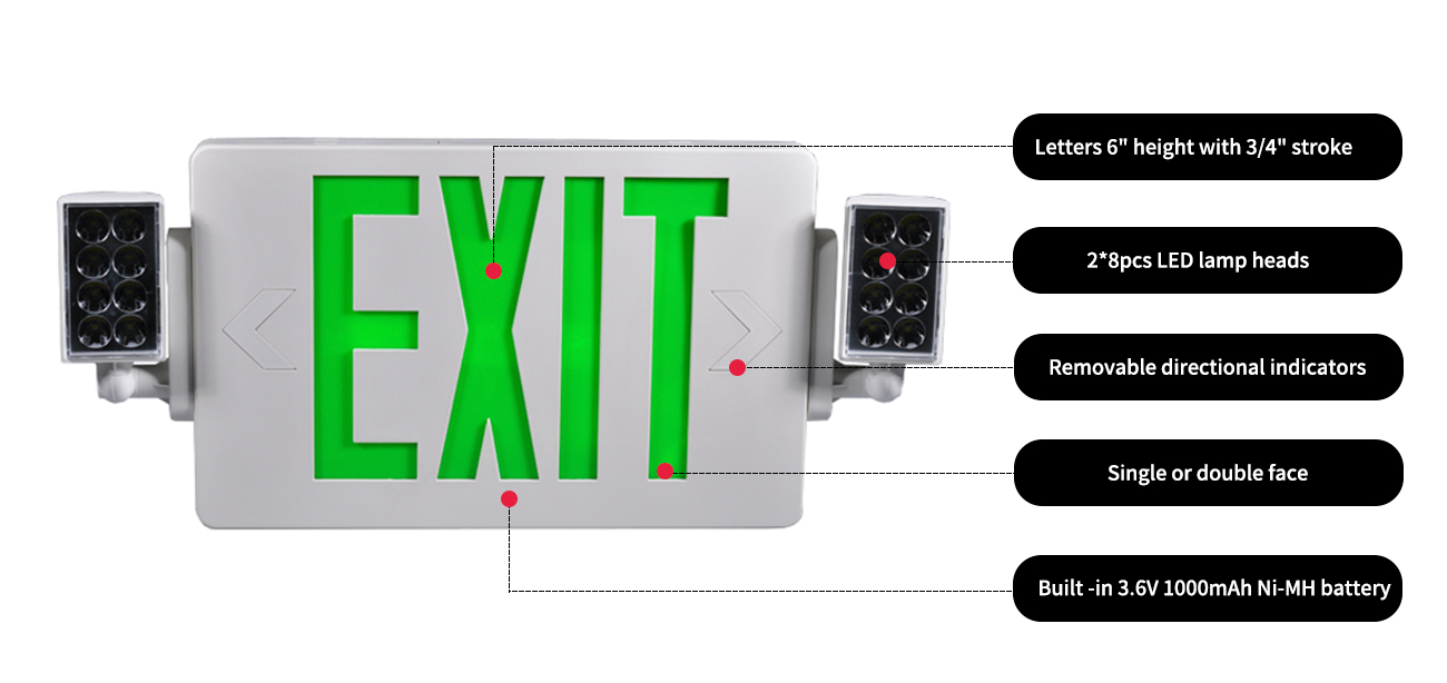 Učinkovit i siguran izlazni znak / kombinacija svjetla za hitne slučajeve. Uštedite novac kupnjom ovog proizvoda 2-u-1. Dugotrajna, nisko održavanje NI-MH baterije. Radi na 120 - 277 VAC Univerzalni napon. Prednja ploča uključuje strijele lijevo/desno. Učvršćivanje je 1 ili 2 strane. Proizvod je u UL -u i ispunjava NFPA 101, OSHA i UL 924 kodove za hitne slučajeve. Kao kućna, komercijalna i industrijska rasvjeta, savršena za hodnik, koridor, bolnicu, apartmane, crkve, trgovačke centre, supermarkete, škole, hotel, pub, restoran, skladišta, uredska zgrada, itd.