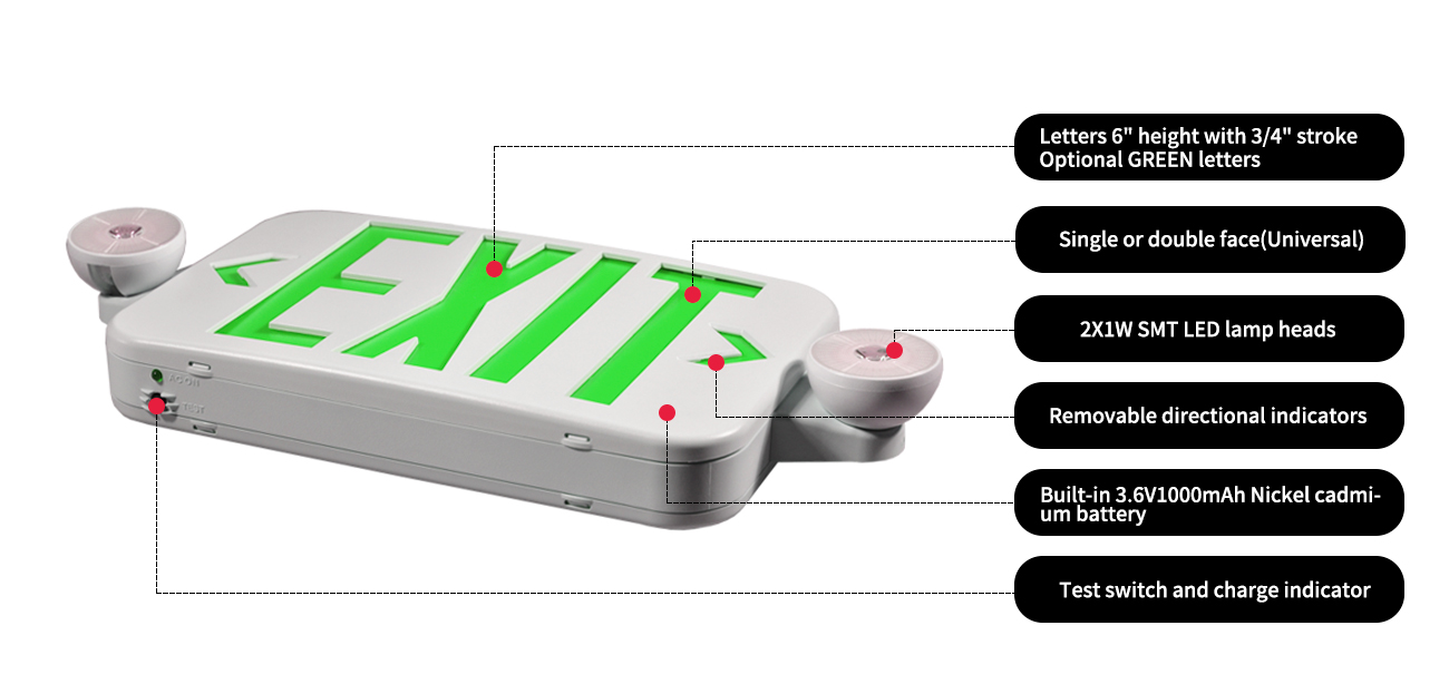 Učinkovit i siguran izlazni znak / kombinacija svjetla za hitne slučajeve. Uštedite novac kupnjom ovog proizvoda 2-u-1. Dugotrajna, nisko održavanje NI-CAD baterije. Radi na 120 - 277 VAC Univerzalni napon. Prednja ploča uključuje strijele lijevo/desno. Učvršćivanje je 1 ili 2 strane. Proizvod je u UL -u i ispunjava NFPA 101, OSHA i UL 924 kodove za hitne slučajeve. Kao kućna, komercijalna i industrijska rasvjeta, savršena za hodnik, koridor, bolnicu, apartmane, crkve, trgovačke centre, supermarkete, škole, hotel, pub, restoran, skladišta, uredska zgrada, itd.