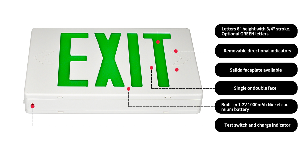 *Osvjetljenje - Osvjetljenje serije LED izlaznog znaka postiže se pomoću dugotrajnih, učinkovitih ultra svijetlih zelenih LED -ova. Difuzor koji podudara u boji eliminira vruća mjesta i pruge, pružajući optimalni izlaz svjetla.