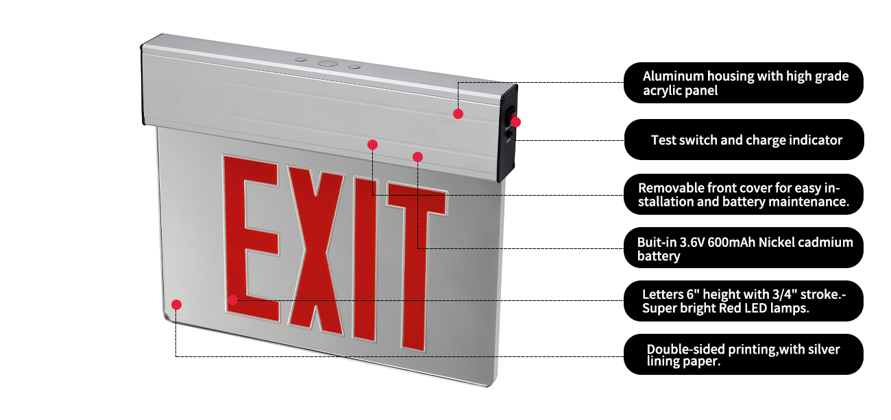 Vrhunski izlazni znak u dizajnu i svestranosti. Ovaj crveni LED rub osvijetljen natpis izlaska riješit će gotovo svaki problem konfiguracije ugradnje.  Ovaj jedan stil omogućava instalaciju stropa, bočne i zidne nosača.  Ploča za osvijetljena rubom izrađena je od akrila visokog stupnja s prilagodljivim strelicama za usmjeravanje kako bi se usmjerilo prema izlaznom smjeru.mirror razdjelnik jednostruki i na verzijama s dvostrukim licem. Umjenjivi prednji poklopac čini instalaciju i održavanje bez glavobolje!